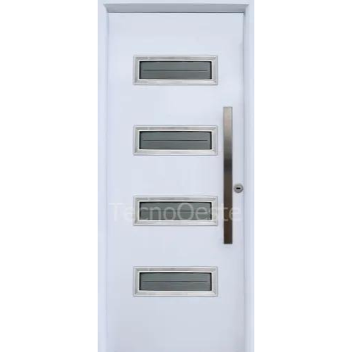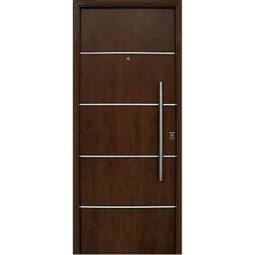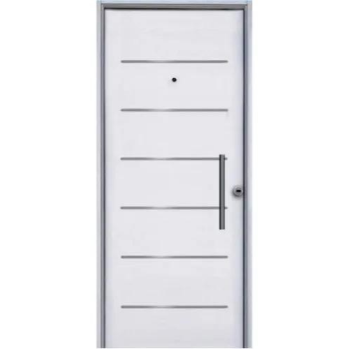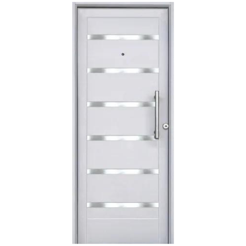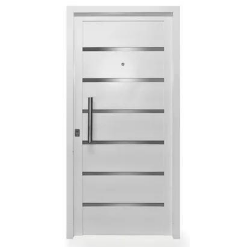 >Estructura de chapa acerada con multirrefuerzos en forma de “U”. >Cerradura multianclaje con 11 barras de acero. >Manija pomo tirador y protector de cilindro de acero. >4 Bisagras de acero